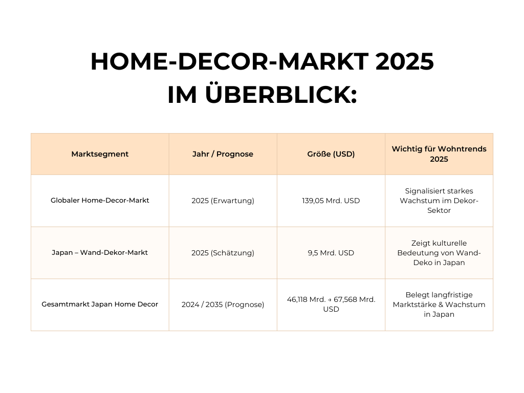 Trends sind am überzeugendsten, wenn man sie mit Daten belegt. Ein Blick auf aktuelle Marktberichte zeigt, dass sich der Home-Decor-Sektor weltweit dynamisch entwickelt – mit Japan als besonders spannendem Markt. Die folgenden Zahlen stammen aus anerkannten Studien und geben einen Ausblick darauf, warum japanische Ästhetik 2025 so stark wächst.